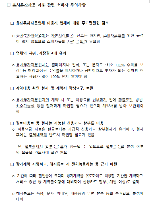실제 피해사례를 보면, A씨는 B사 직원이 500만 원을 1년 내에 5배로 만들어준다며 유사투자자문서비스 가입을 권유해 1년 이용계약을 하고 300만 원을 할부 결제한 후 10% 이상의 투자 손실이 발생하는 등 신뢰가 가지 않아 계약해지를 요청했으나 환급을 거부당했다.