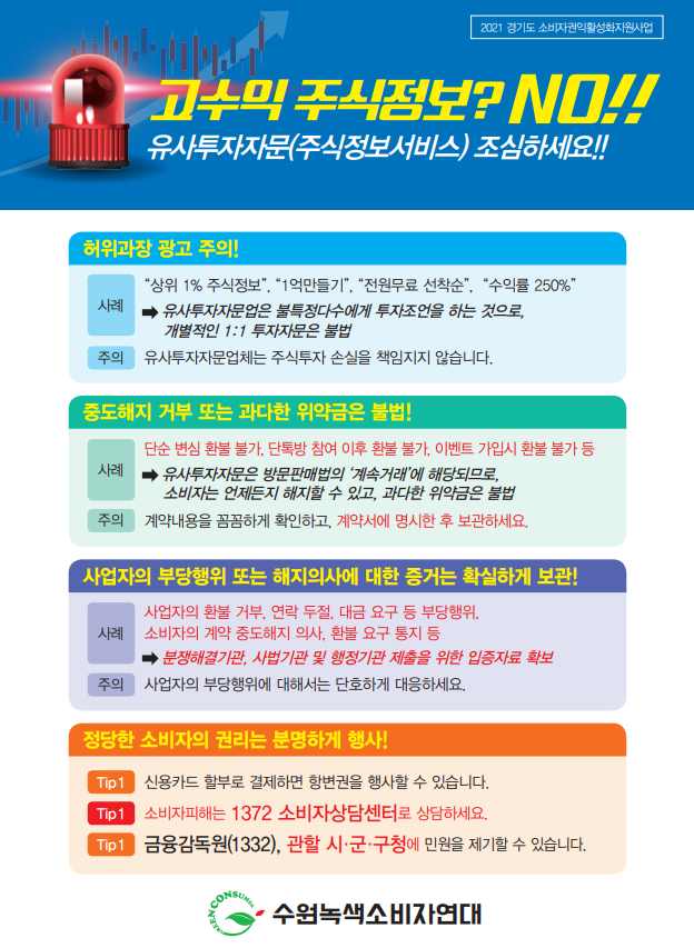 수원녹색소비자연대(대표 손철옥)가 경기도 소비자권익활성화지원사업의 일환으로 수행한 ‘주식정보서비스(유사투자자문) 실태조사’에 따르면, 주식투자 경험이 있는 전국의 성인 1,000명을 설문조사한 결과, 유료 유사투자자문 이용자 143명 중 119명(83.2%)이 피해 또는 불만을 경험했다고 응답했다.