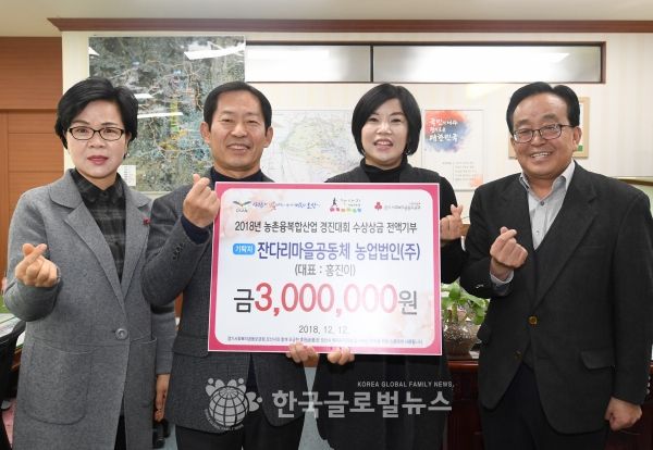 지난 10월 개최한 경진대회에서 잔다리마을 공동체는 경영체 친환경부분에서 농림축산식품장관상 우수 표창과 함께 상금 300만원을 수상했다. 잔다리마을공동체는 2011년 오산시 세교동 잔다리마을에서 시작된 마을기업으로 지역주민들이 지역의 농산물 콩을 활용한 제품을 제조 판매하여, 지역 주민들의 소득창출과 일자리 창출에 앞장서고 있다.