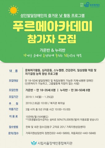 모집 대상은 만 18세~50세 발달장애인 및 독립보행이 가능한 지체장애인, 뇌병변장애인으로 가온반(만 18~35세) 6명, 누리반(만 36~50세) 6명을 모집한다. 모집 기간은 1월 14일(월)부터 25일(금)까지이고 이용료는 15만원이며 기초생활보장수급자는 50% 할인이 적용된다.