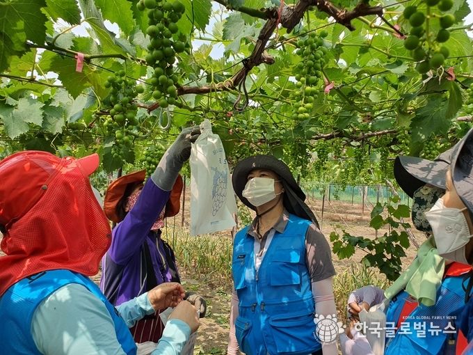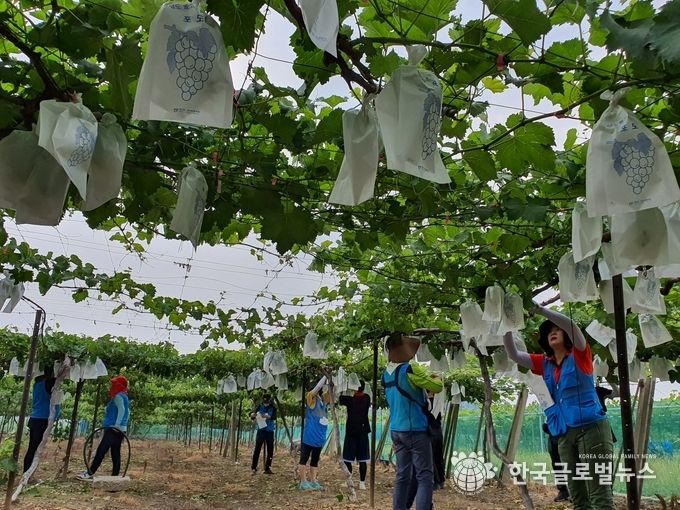코로나19로 봉사자가 줄어든 농촌현장에 늦어진 포도봉지 씌우기 작업에 필요한 일손을 '경기사랑봉사회'(이하 봉사회)가 포도송이 열린 마냥 땀방울을 쏟아냈다.
