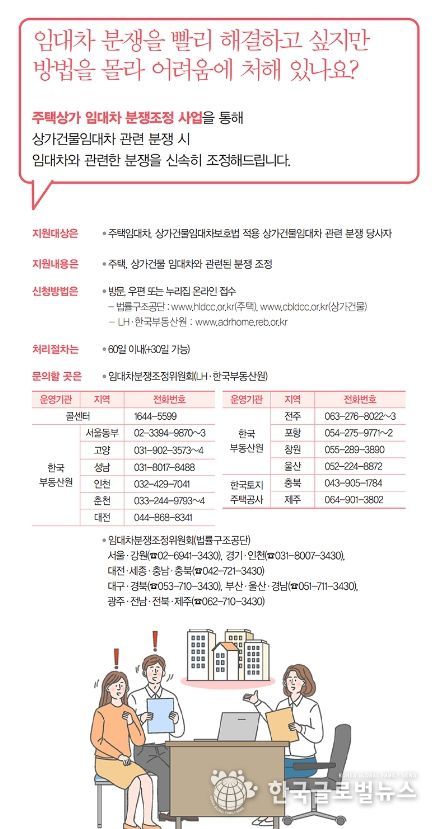 (한국글로벌뉴스 - 박경희 기자) 주택상가 임대차 분쟁조정 사업을 통해 상가건물임대차 관련 분쟁 시 임대차와 관련한 분쟁을 신속히 조정해드립니다.