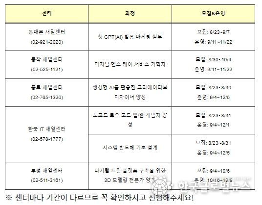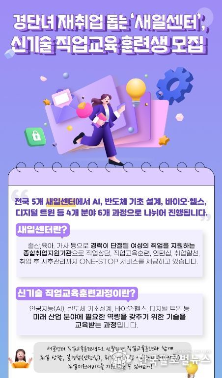 (한국글로벌뉴스 - 박경희 기자) 경단녀 재취업 돕는 ‘새일센터’에서 신기술 직업교육 훈련생을 모집합니다. 전국 5개 새일센터에서 AI, 반도체 기초 설계, 바이오·헬스, 디지털 트윈 등 4개 분야 6개 과정으로 나뉘어 진행됩니다.