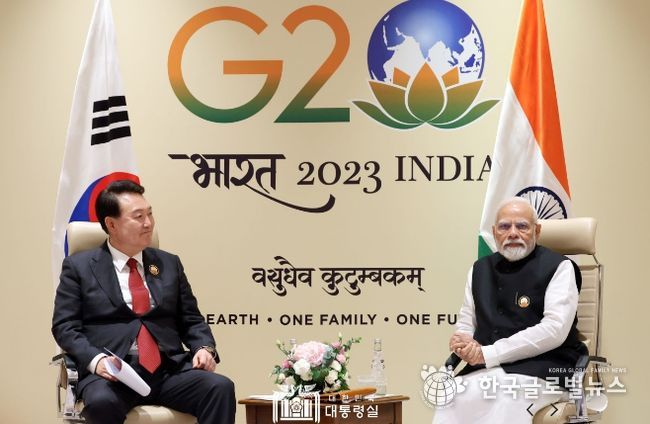 (한국글로벌뉴스 - 박소연 기자) G20 정상회의 참석을 위해 인도 뉴델리를 방문 중인 윤석열 대통령은 오늘(현지시간 9. 10, 일) '나렌드라 모디(Narendra Modi)' 인도 총리와 정상회담을 가졌다.