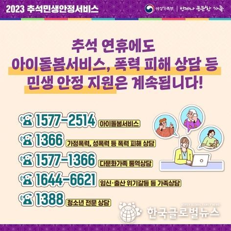(한국글로벌뉴스 - 박경희 기자) 추석 연휴에도 아이돌봄서비스, 폭력 피해 상담 등 민생 안정 지원은 계속됩니다.