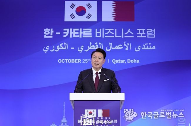 (한국글로벌뉴스 - 박소연 기자) 카타르를 국빈 방문 중인 윤석열 대통령은 오늘(현지시간 10. 25, 수) 오후 한-카타르 비즈니스 포럼에 참석해 그간의 양국 경제협력 성과를 평가하고 경제인들의 노고를 치하했다. 또한, 세계 경제의 대전환기를 맞아 새로운 50년의 공동 번영을 위한 새로운 파트너십을 함께 준비해 나갈 것을 당부했다.