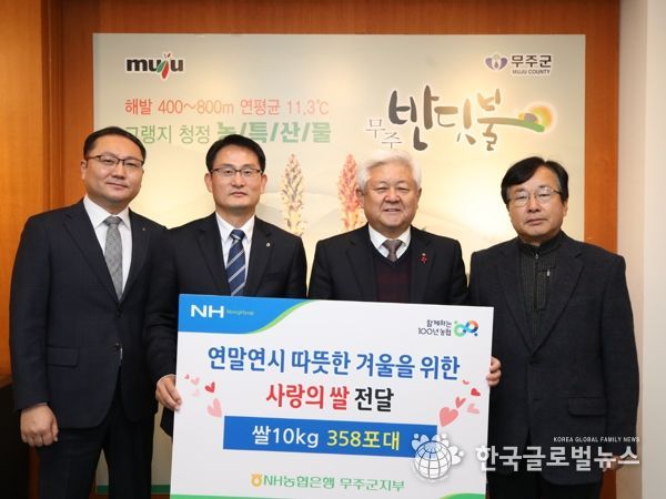 (한국글로벌뉴스 - 박소연 기자) NH농협무주군지부가 지난 15일 무주군에 쌀 358포대(1천만 원 상당)를 무주군에 기탁해 훈훈함을 주고 있다.