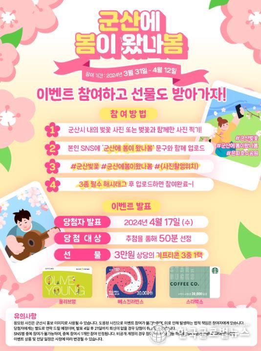 (한국글로벌뉴스 - 김정현 기자) 군산시는 벚꽃 시즌을 맞아 군산 시내 벚꽃 명소 홍보를 위한 ‘군산에 봄이 왔나봄’ 벚꽃 인증샷 이벤트를 4월 12일까지 진행한다.