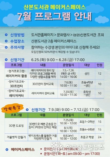 (한국글로벌뉴스 - 박소연 기자) 군포시 산본도서관은 오는 25일부터 메이커스페이스 7월 프로그램 수강생을 모집한다.