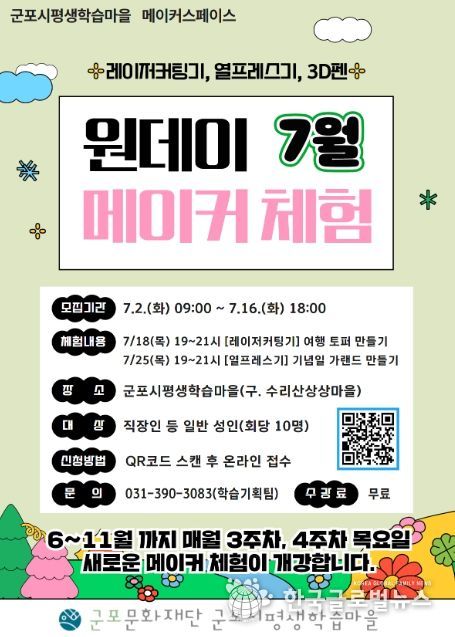 (한국글로벌뉴스 - 박소연 기자) 군포문화재단은 군포시평생학습마을에서 운영하는 메이커스페이스 '원데이 메이커 체험' 7월 프로그램 참여자를 오는 2일부터 모집한다고 밝혔다.