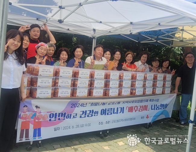 (한국글로벌뉴스 - 박소연 기자) 군포시 군포2동 지역사회보장협의체는 6월 28일 '희망나눔! 군포2동'특화사업으로 기후변화 대응이 어렵고 건강관리에 취약한 저소득층을 대상으로 안전하고 건강하게 여름을 날 수 있는 ‘김치’ 나눔행사를 가졌다.