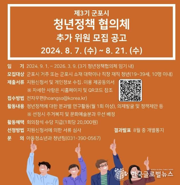 (한국글로벌뉴스 - 박소연 기자) 군포시는 청년의 요구를 반영한 정책의제 발굴과 실현 등을 위해 ‘제3기 청년정책협의체’ 위원을 추가로 공개 모집한다.