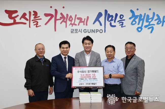 (한국글로벌뉴스 - 박소연 기자) 경기헤럴드(대표이사 임종호)가 23일 군포시에 출간된 도서를 전달하는 기증식을 가졌다. 기증식에는 이화용 (주)이너프 회장, 이강무 군포새마을금고 이사장, 이정준 (주)모루시스템 대표이사. 이성제 한국유지관리조합 회장이 참석했다.
