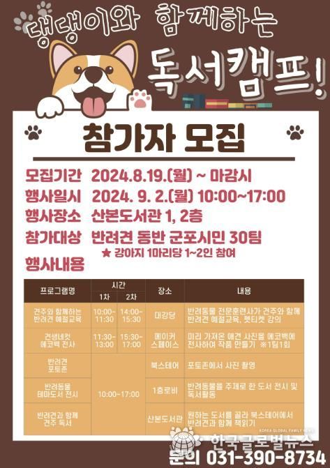 (한국글로벌뉴스 - 박소연 기자) 군포시 산본도서관이 오는 9월 2일 반려견과 함께 도서관을 즐길 수 있는 ‘댕댕이와 함께하는 독서캠프’프로그램을 운영한다.