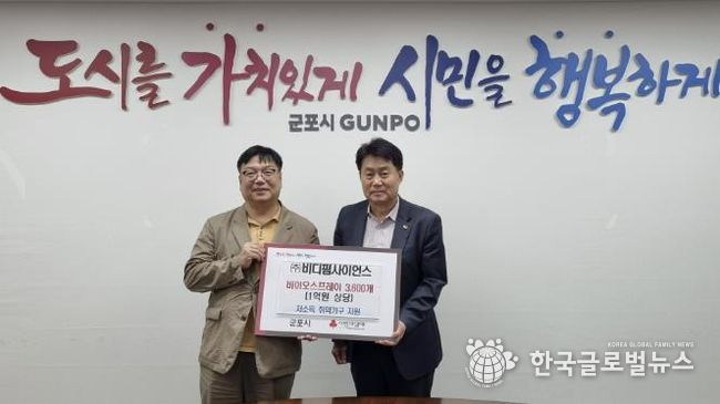 (한국글로벌뉴스 - 박소연 기자) 지난 11일 주식회사 비디펌사이언스가 군포시를 방문해 바이오스프레이 3,600개(1억원 상당) 전달식을 가졌다.