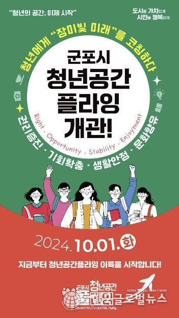 (한국글로벌뉴스 - 박소연 기자) 군포시는 오는 10월 1일 청년들의 다양한 활동을 지원하는 복합 문화 공간 ‘청년공간 플라잉’을 개관한다. 이 공간은 청년들이 새로운 일에 도전하고 자립 역량을 키울 수 있도록 돕는 핵심 플랫폼으로 자리매김할 예정이다.