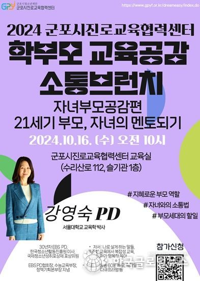 (한국글로벌뉴스 - 박소연 기자) 군포시진로교육협력센터에서는 "21세기 부모, 자녀의 멘토 되기"를 주제로 학부모 교육공감 소통브런치(자녀부모공감편)가 2024년 10월 16일 오전 10시 진행된다.
