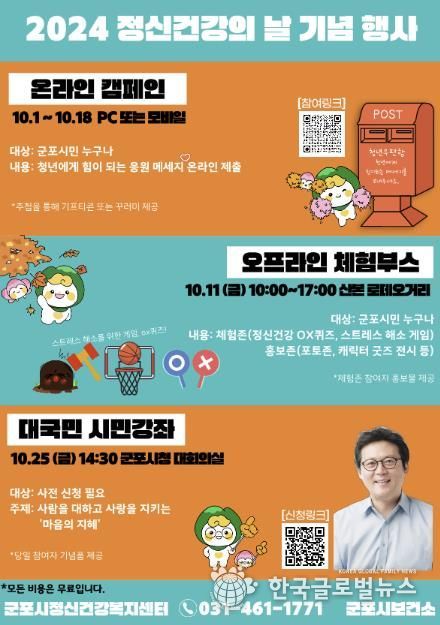 (한국글로벌뉴스 - 박소연 기자) 군포시정신건강복지센터(부설)군포시자살예방센터가 10월 10일 세계 정신건강의 날을 맞이하여 정신건강을 위한 다양한 행사를 개최한다.