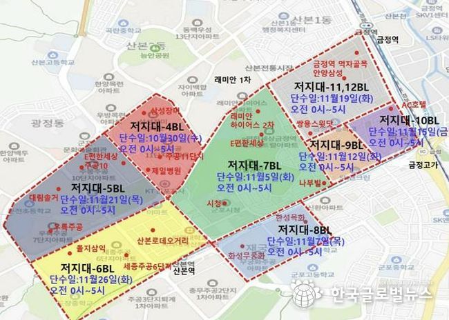 (한국글로벌뉴스 - 박소연 기자) 군포시는 2023년에 광정동, 산본1동, 산본2동 일부 지역에 1차년도 블록시스템 구축 사업을 성공적으로 마치고, 올해 2차년도 블록시스템 구축을 위하여 궁내동, 금정동, 광정동, 산본1동, 재궁동에 10월 30일부터 11월 26일까지 블록고립 확인을 시행한다.