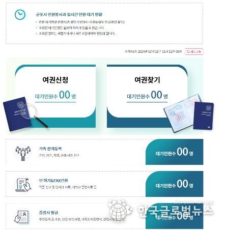 민원대기 현황 서비스는 군포시 홈페이지 메인화면 또는 전자민원-여권발급-실시간 민원대기 현황에서 이용할 수 있다.
