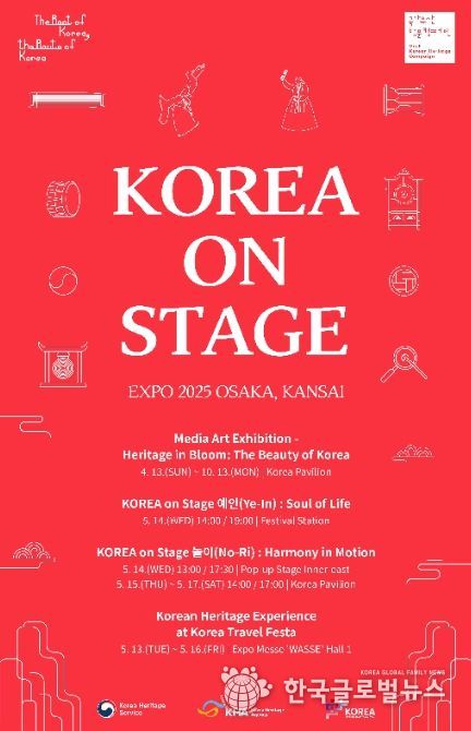 2025 오사카·간사이 엑스포에서 5월 13일부터 17일까지 운영되는 ‘한국 주간’에서는 우리나라 무형유산 명인들의 전통 공연, 미디어아트 전시 등으로 구성된 ‘코리아 온 스테이지’ 행사가 개최되어 전 세계 관람객들이 우리 국가유산의 미래가치를 함께 누릴 예정이다.