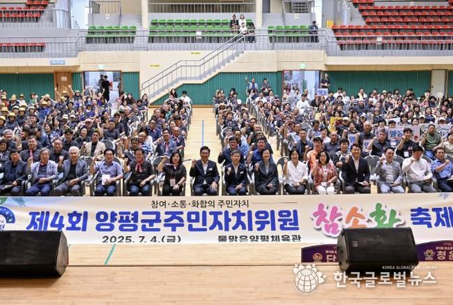 (한국글로벌뉴스 - 박소연 기자) 양평군은 4일 물맑은 양평체육관에서 양평군 주민자치협의회 주관으로 ‘제4회 주민자치 참소화(참여·소통·화합) 축제’를 성황리에 개최했다고 밝혔다.