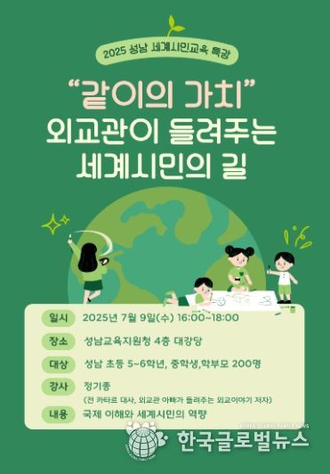 (한국글로벌뉴스 - 박소연 기자) 성남교육지원청은 지난 7월 9일, 성남교육지원청에서 관내 초·중등 학생, 학부모, 교원을 대상으로 세계시민교육 특강 '같이의 가치, 외교관이 들려주는 세계시민의 길'을 개최했다.