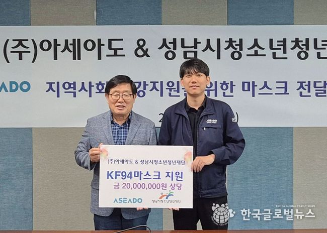 (한국글로벌뉴스 - 박소연 기자) 성남시청소년청년재단 수정유스센터는 성남시 상대원동에 위치한 마스크 전문 제조업체인 ㈜아세아도가 최근 코로나 재 확산 움직임에 대비 지역 청소년과 주민의 건강한 성장을 지원하기 위해 자사 KF94 마스크를 기부했다고 9일 밝혔다.