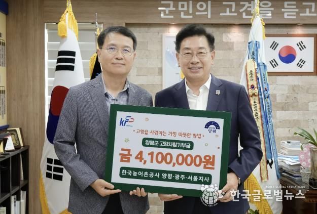한국농어촌공사 양평·광주·서울지사 임직원 38명은 고향에 대한 애정과 지역 상생의 의미를 담아 자발적으로 총 410만 원을 기부했으며, 해당 기부금은 양평군의 다양한 공익사업에 다양한 공익사업에 사용될 예정이다.