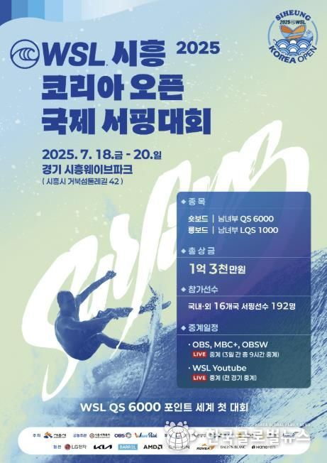 (한국글로벌뉴스 - 박소연 기자) ‘2025 월드서프리그(WSL) 시흥 코리아 오픈 국제서핑대회’가 오는 18일 시흥시 거북섬 웨이브파크에서 개막한다. 이번 대회는 세계 최초로 인공 파도풀에서 열리는 WSL QS6000 공식 대회로, 16개국에서 참가한 선수 192명이 출전해 역대 최대 규모로 치러진다.