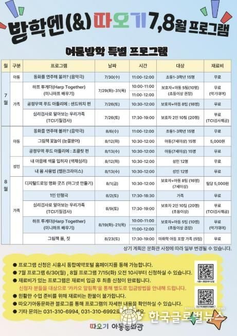 (한국글로벌뉴스 - 박소연 기자) 시흥시 따오기아동문화관은 여름방학을 맞아 7월 말부터 8월까지 온 가족이 함께할 수 있는 특별 프로그램 ‘방학엔(&)’을 운영한다.