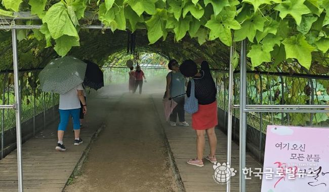 지난 7월 31일 설치를 마친 쿨링 포그는 연꽃테마파크 내 호박덩쿨하우스 구간을 따라 약 65미터 구간에 조성됐다. 쿨링포그는 수돗물을 인공 안개로 분사하는 장치다. 물안개가 분사되는 과정에서 열을 흡수해 주변 온도를 낮춰주는 친환경 냉방 시스템으로, 체감온도를 낮추는 데 효과적이어서 불볕더위 속에서도 시원하고 쾌적한 관람 환경을 제공한다.
