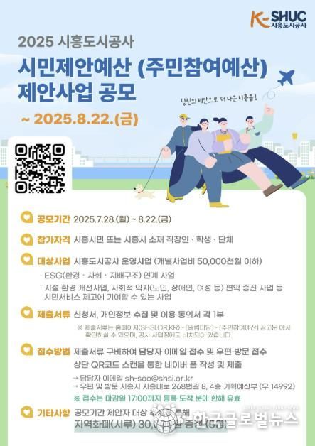 (한국글로벌뉴스 - 박소연 기자) 시흥도시공사는 2026년 예산 편성을 위해‘시민제안예산 제안사업 공모’를 8월 22일까지 진행한다고 밝혔다.