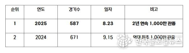 587경기만에 1,000만 관중을 달성하며, 역대 최초 1,000만 관중을 달성한 2024시즌 671경기만의 1,000만 관중 달성 기록을 84경기 단축했다.
