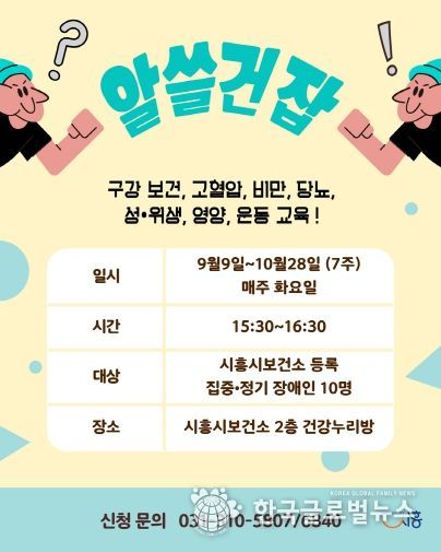 (한국글로벌뉴스 - 박소연 기자) 시흥시는 오는 9월 9일부터 10월 28일까지 관내 장애인의 건강관리를 돕기 위해 ‘알쓸건잡(알아두면 쓸모 있는 건강 잡학사전)’ 프로그램을 시흥시보건소 2층 건강누리방에서 운영한다.