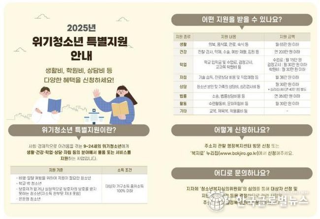 (한국글로벌뉴스 - 박소연 기자) 가평군이 사회‧경제적 어려움에 처한 위기청소년을 대상으로 특별지원 신청을 9월 30일까지 받고 있다. 이번 지원은 '청소년복지지원법' 제14조에 근거해 추진되는 것으로, 보호자가 없거나 실질적 보호를 받지 못하는 청소년과 저소득 한부모 가정 자녀 등이 주요 대상이다.