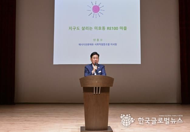 이번 강연은 ‘지구도 살리는 미호동 RE100’을 주제로, 에너지전환해유 사회적협동조합 양흥모 이사장이 강연을 진행했다. 양 이사장은 미호동에서 주민들과 함께 탄소중립(넷 제로)을 목표로 RE75를 달성하고, 100% 에너지 자립마을 조성을 위해 꾸준히 노력해온 실제 사례를 소개했다.