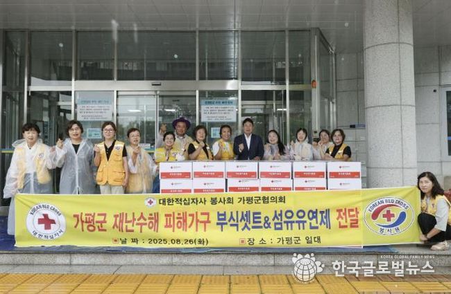 (한국글로벌뉴스 - 박소연 기자) 대한적십자사 가평군협의회는 최근 집중호우로 피해를 입은 가평군 내 수해 가구를 위해 2천만 원 상당의 부식 세트와 섬유유연제를 기탁했다.