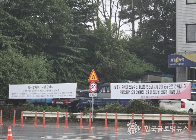 (한국글로벌뉴스 - 박소연 기자) 지난 7월20일 집중호우로 발생한 매몰 및 실종사고와 관련하여 실종자 가족들이 가평소방서 앞에 감사의 마음을 담은 현수막을 게시해 주위를 훈훈하게 하고 있다.