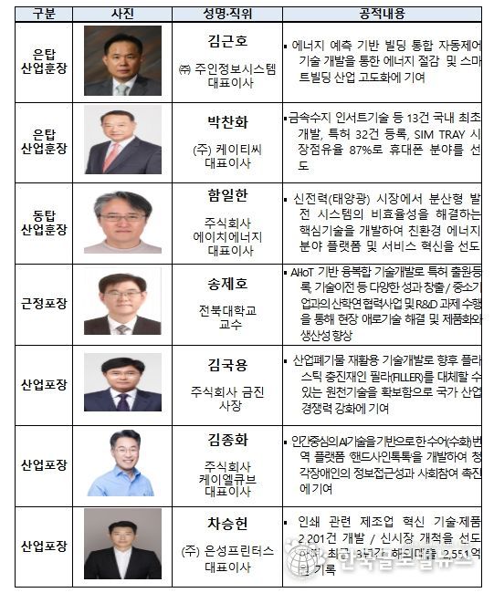 4일 열린 개막식에서는 에너지 절감을 위한 빌딩 통합 자동제어 시스템을 개발한 ㈜주인정보시스템 김근호 대표와 휴대폰 SIM Tray 국내시장 점유율 1위를 차지한 ㈜케이티씨 박찬화 대표가 은탑산업훈장을, 신전력 시장에서 분산형 발전시스템을 개선한 주식회사 에이치에너지 함일한 대표가 동탑산업훈장 수상의 영예를 안았다.