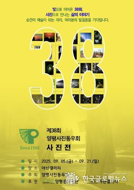 (한국글로벌뉴스 - 박소연 기자) 양평문화재단은 아신갤러리 9월 대관 기획 전시로 5일부터 21일까지 ‘제38회 양평사진동우회 사진전’을 개최한다.