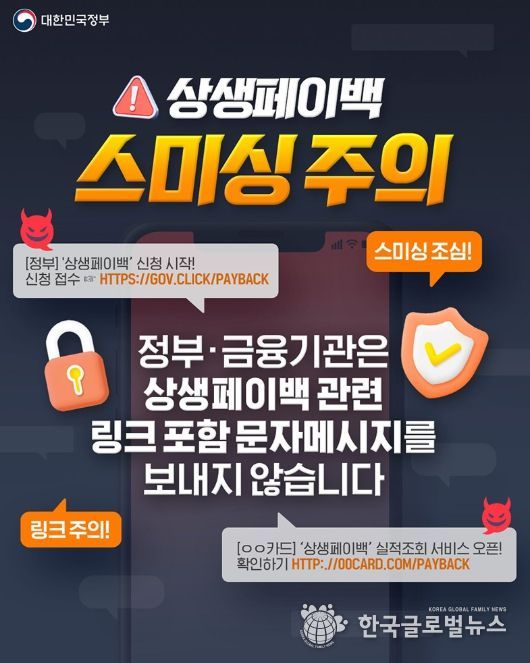 (한국글로벌뉴스 - 박경희 기자) 정부·금융기관은 상생페이백 관련 링크 포함 문자메시지를 보내지 않습니다.