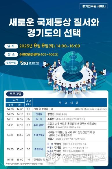 (한국글로벌뉴스 - 박소연 기자) 경기연구원은 오는 9일 수원컨벤션센터에서 ‘새로운 국제통상 질서와 경기도의 선택’이라는 주제로 세미나를 개최한다.