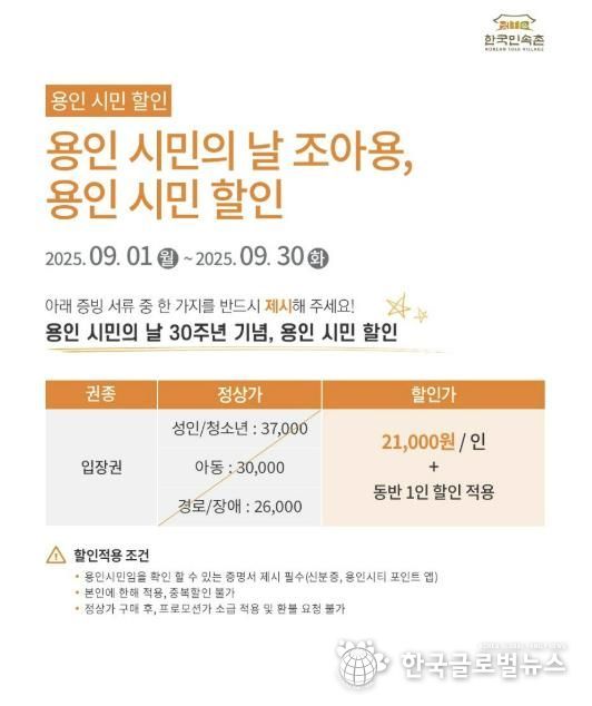 (한국글로벌뉴스 - 박소연 기자) 용인특례시는 ‘제30회 용인시민의 날’을 기념해 9월 한국민속촌과 용인투어패스를 할인 제공하는 특별 행사를 진행한다고 8일 밝혔다.