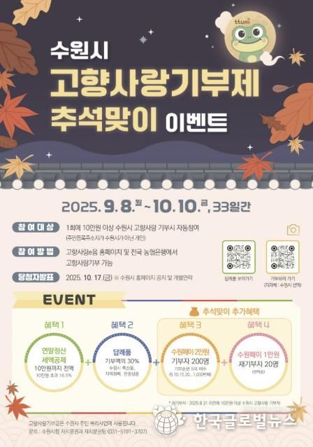 (한국글로벌뉴스 - 박소연 기자) 수원시는 8일부터 10월 10일까지 33일간 ‘수원시 고향사랑기부제, 추석맞이 감사이벤트’를 연다.