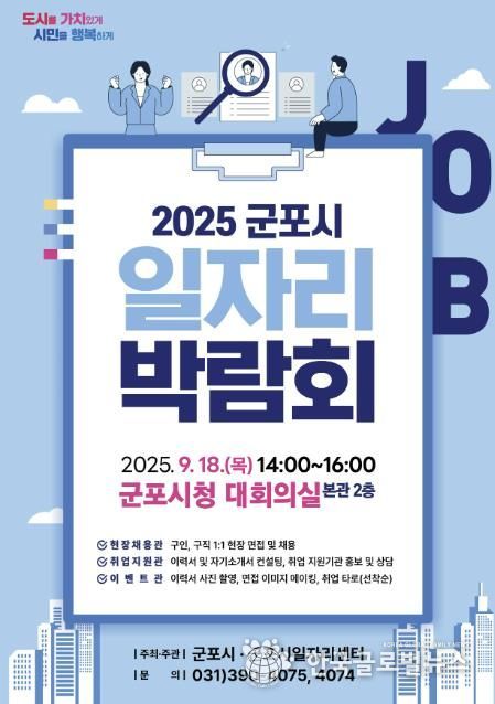 (한국글로벌뉴스 - 박소연 기자) 군포시는 오는 9월 18일 오후 2시, 군포시청 대회의실에서 ‘2025년 하반기 군포시 일자리 박람회’를 개최한다. 이번 박람회는 지역 내 우수 기업과 구직자가 직접 만나는 채용의 장으로 일자리 기회를 제공할 예정이다.