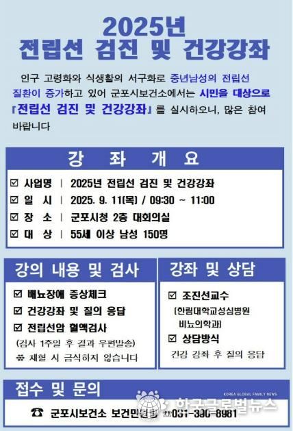 (한국글로벌뉴스 - 박소연 기자) 군포시보건소는 오는 9월 11일 군포시청 대회의실에서 55세이상 남성 전립선암 무료검진 및 건강강좌를 실시한다고 밝혔다.