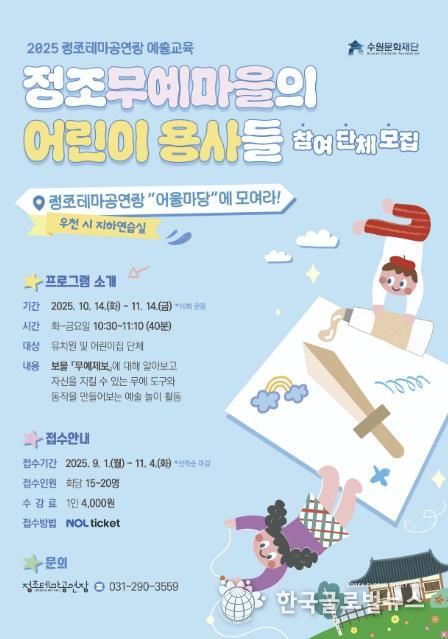 (한국글로벌뉴스 - 박소연 기자) 수원문화재단은 오는 10월 14일부터 11월 14일까지 정조테마공연장 어울마당에서 ‘2025 정조테마공연장 예술교육 '정조무예마을의 어린이 용사들'’을 진행한다.