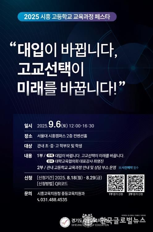 (한국글로벌뉴스 - 박소연 기자) 경기도시흥교육지원청은 9월 6일 서울대학교 시흥캠퍼스 교육협력동 컨벤션홀에서, 시흥 관내 초중고 학부모 및 학생 그리고 교원 500여 명을 대상으로 『2025 시흥 고등학교 교육과정 페스타』를 성황리에 개최했다.