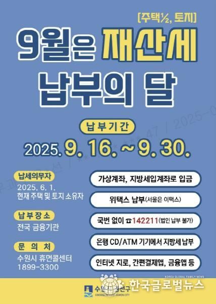 (한국글로벌뉴스 - 박소연 기자) 수원시 권선구는 2025년 9월 정기분 재산세 551억원을 부과한다. 이는 전년 대비 21억원(3.9%)가 증가한 것으로, 주택가격 및 공시지가의 상승이 세액 증가의 주요 원인으로 분석된다.